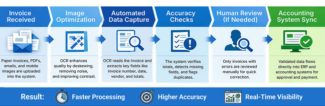 An OCR-driven invoice workflow transforms a fragmented, paper-heavy process into a streamlined digital operation. From capture to integration, each step improves speed, accuracy, and visibility.